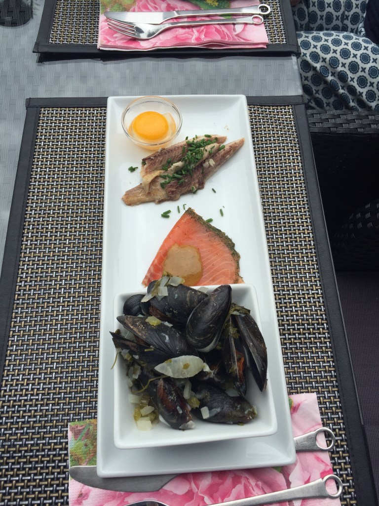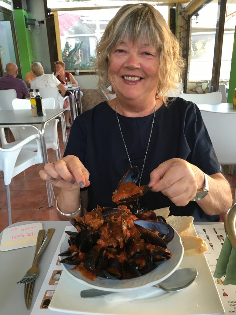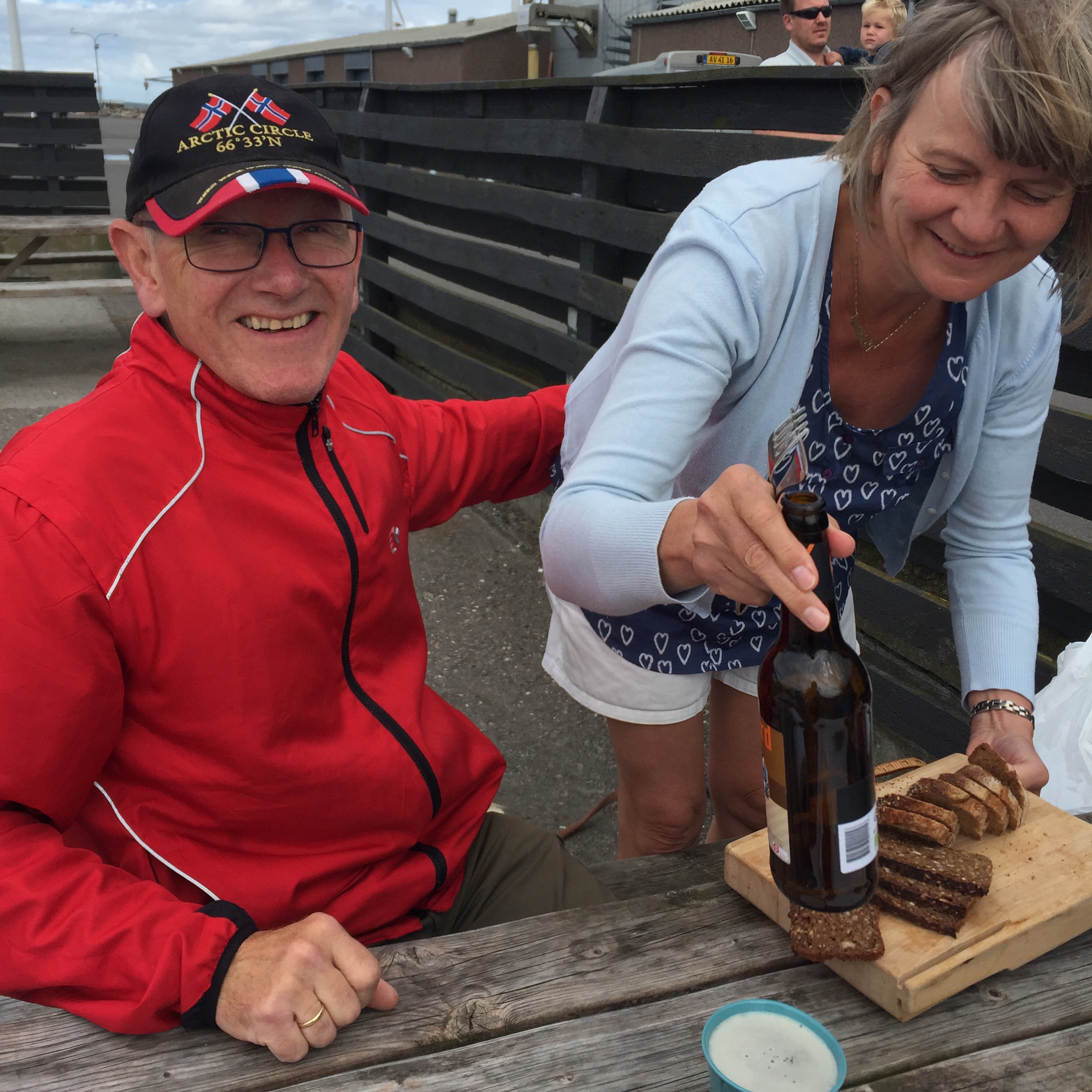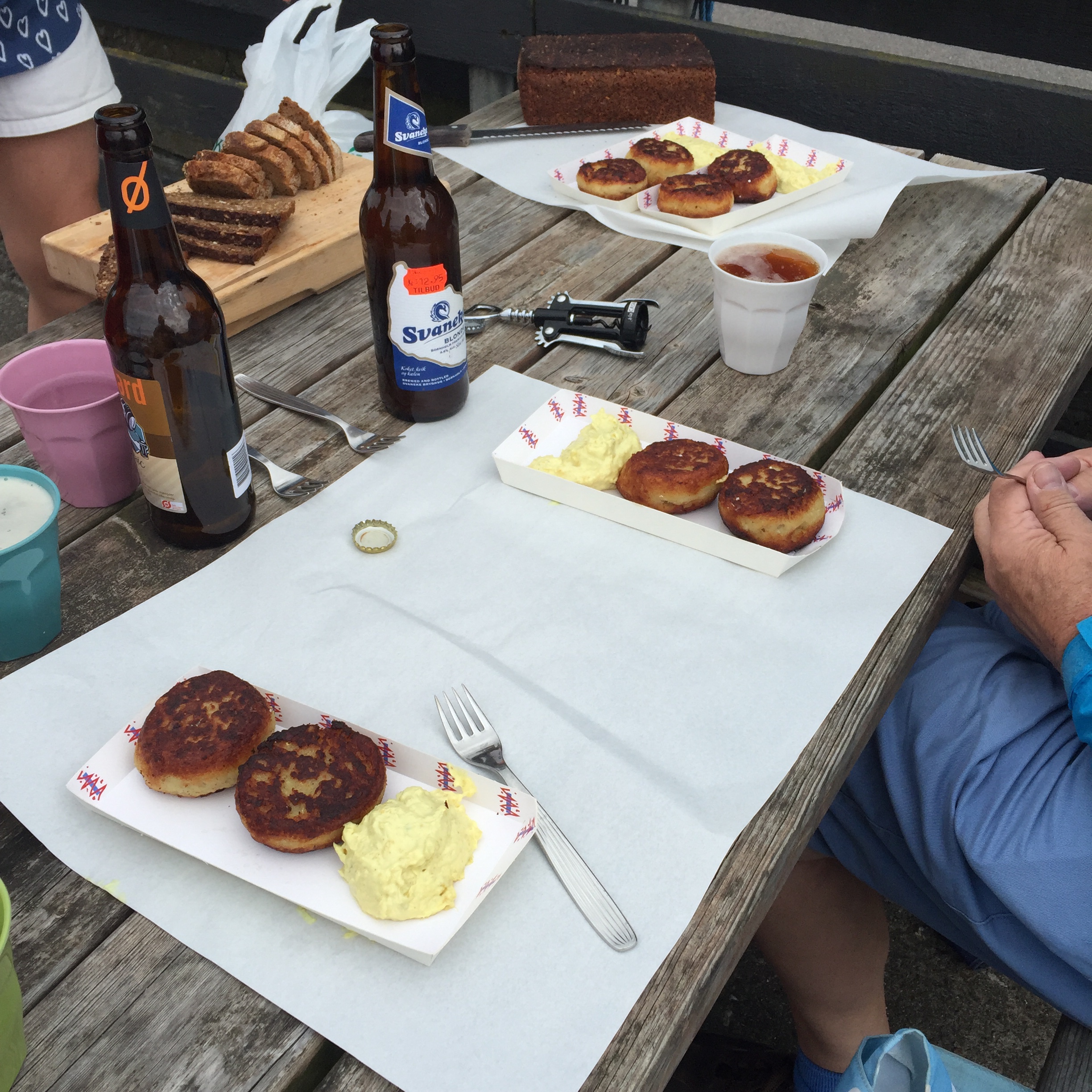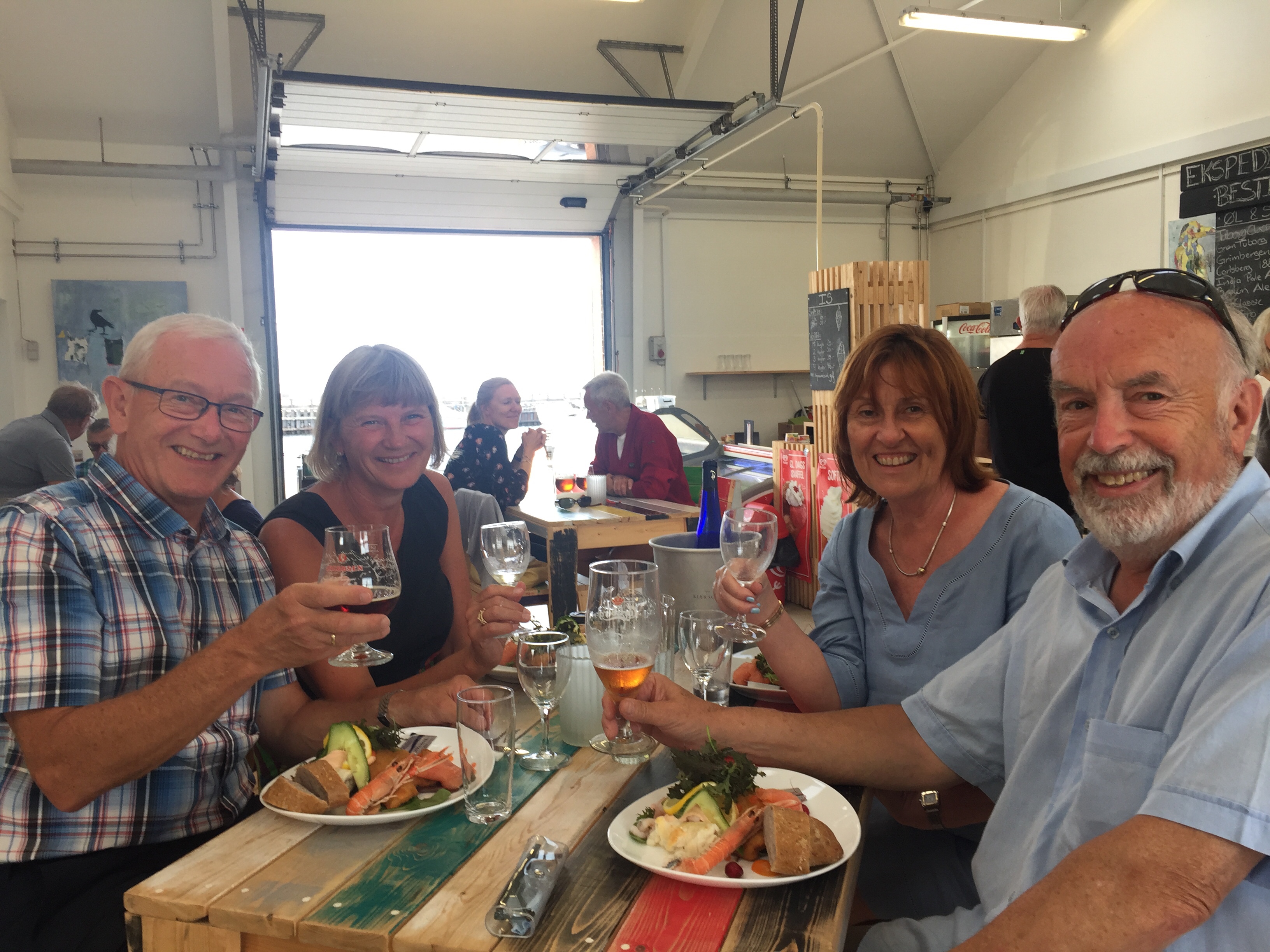 The meal consists of home made gravlax, (Gravad Lax meaning buried salmon) steamed mussels and smoked fish with egg. Beer and wine obviously. We spend a great day with Yens and Lisbet.