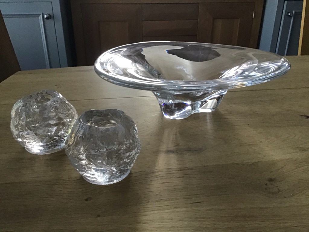 On a previous trip to Denmark with my sister Dot, Yens cooked us the most delicious pork dish and we have used his recipe ever since (see below). It was one of the funniest trips we’ve ever been on. We stayed in Copenhagen with Henrik’s brother and slept in a basement bedroom. It was very dark down there and as we opened the door, we were greeted with a full size male puppet with a huge beard. My sister and I nearly had a fit and never forgot that cellar. We did a lot of shopping in Copenhagen, including a 4ft candle holder, two metal chickens for egg storage, various bottles of drink and a huge suitcase, all carried on as hand luggage. Another time, we drove up to Sweden to visit the Orrefors glass factory and purchased some beautiful glass. We also took these on as hand luggage, weighing 40kilos! Those were the days.
