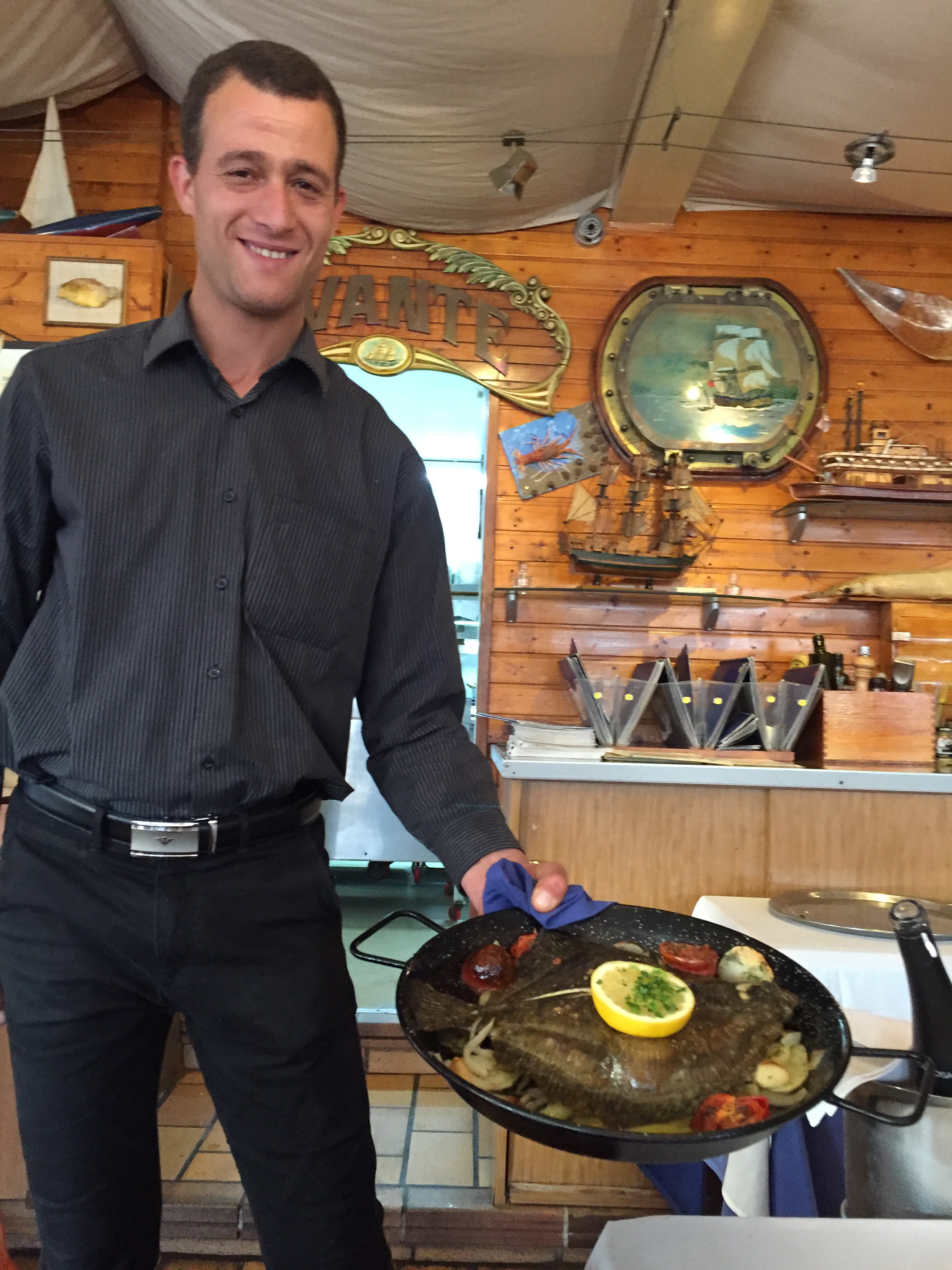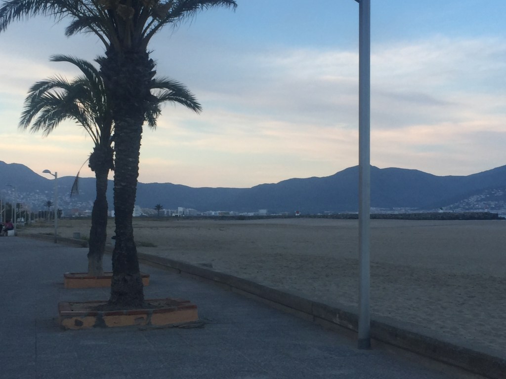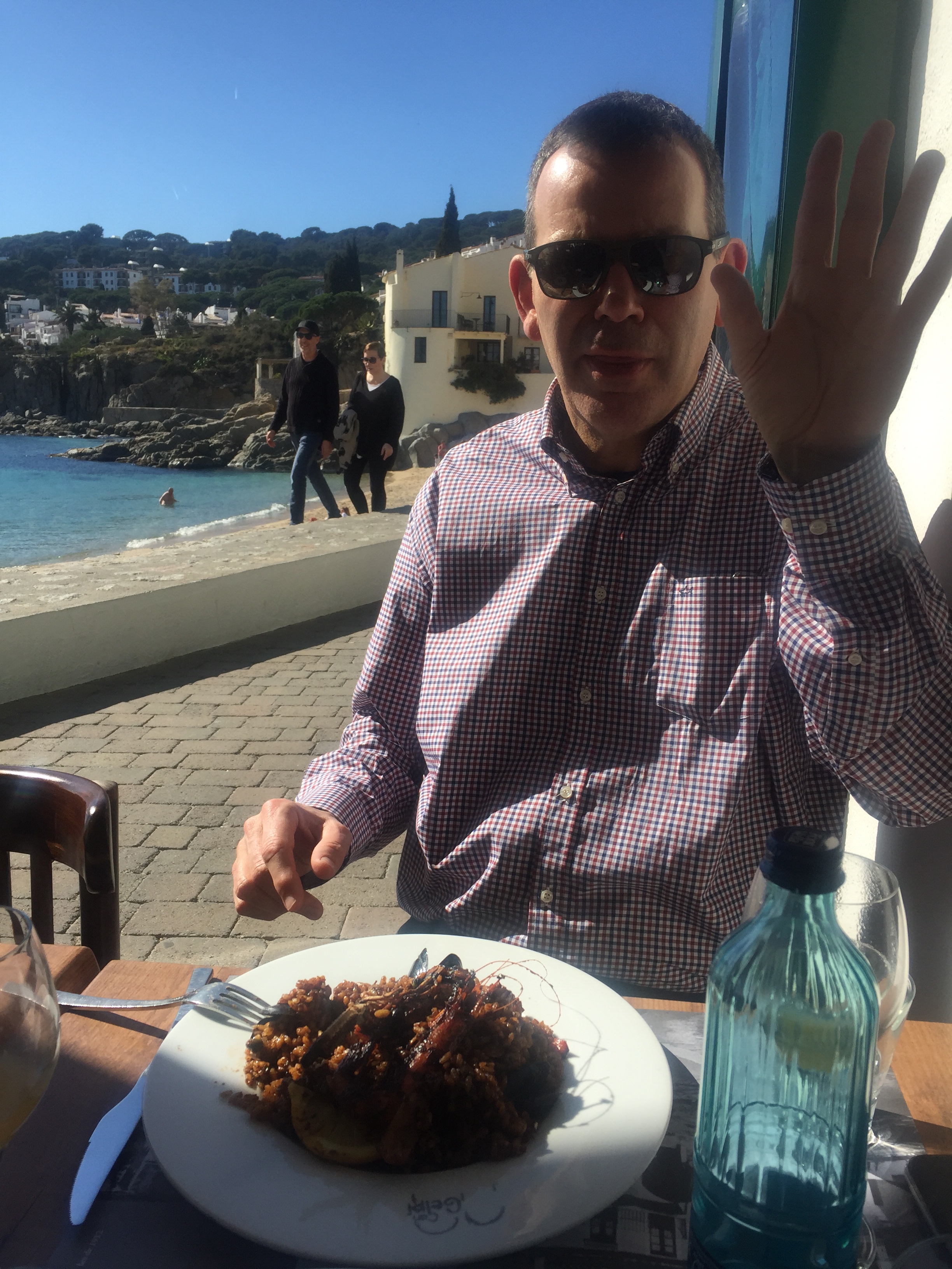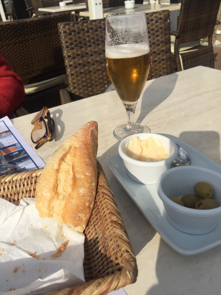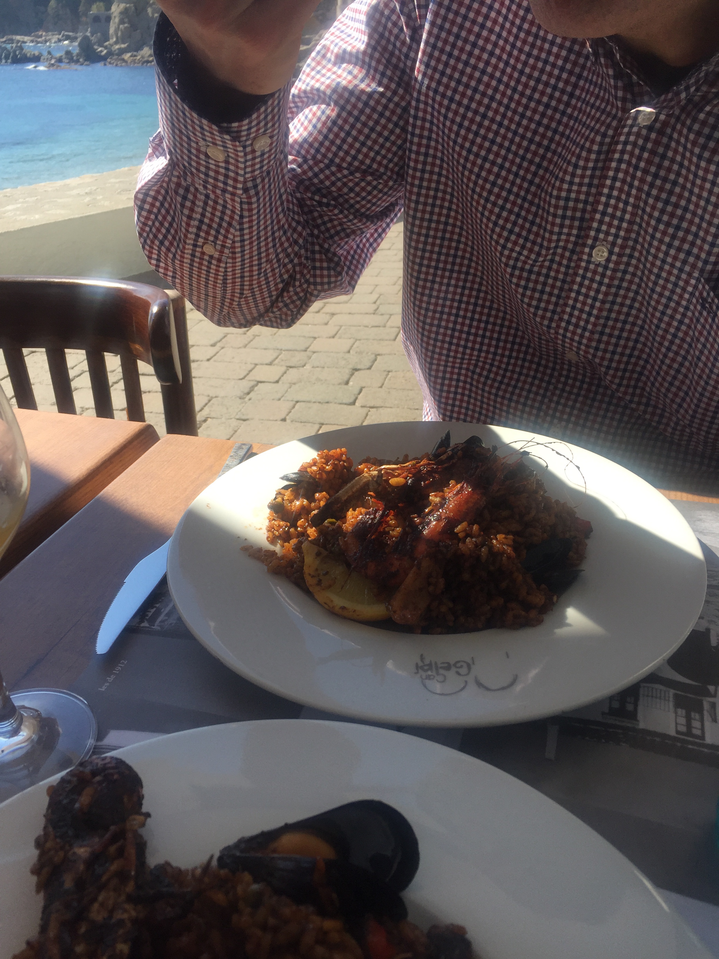 Pierre takes us to one of the many great restaurants on the front and we sit overlooking the sea, drinking white sangria (see recipe) a much more refreshing drink that the typical red sangria. We eat a delicious paella made with arroz de Pals (rice).
